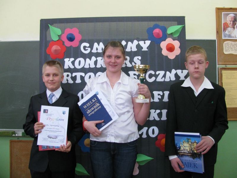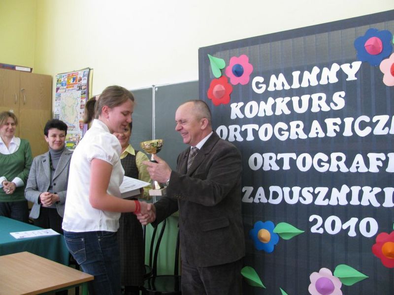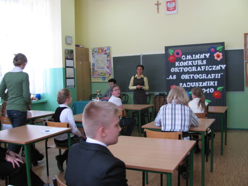 Dnia 23 lutego 2010 roku w Szkole Podstawowej im. Mikołaja Kopernika w Zadusznikach odbyły się coroczne zmagania uczniów Gminy Wielgie w dziedzinie ortografii. Konkurs został objęty patronatem Wójta Gminy Wielgie, który ufundował dla zwycięzcy nagrodę książkową oraz puchar. Tytuł „Asa ortografii” zdobyła Joanna Martewicz – uczennica ze SP w Zadusznikach. Drugie miejsce zajął Jacek Chmaruk, a trzecie Robert Wojciechowski. Obydwaj chłopcy są uczniami Szkoły Podstawowej w Wielgiem. Wszyscy uczestnicy otrzymali pamiątkowe dyplomy, a zwycięzcy odebrali nagrody rzeczowe z rąk gościa konkursu p. T. Wiewiórskiego Wójta Gminy Wielgie oraz p. Z. Kuczmarskiej Dyrektor SP im. M. Kopernika w Zadusznikach. Po konkursowych emocjach, pokrzepieni słodkim poczęstunkiem, wszyscy uczestnicy rozjechali się do swoich szkół.