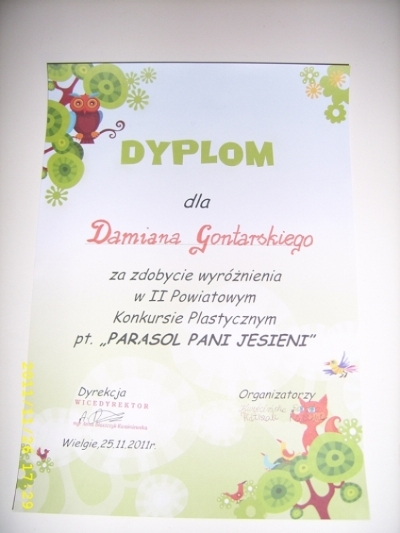 W dniu 25 listopada 2011 roku w Zespole Placówek Oświatowych w Wielgiem odbył się II Powiatowy Konkurs Plastyczny "Parasol Pani Jesieni". Wzięli w nim udział uczniowie klas III z powiatu lipnowskiego. W konkursie tym wziął udział uczeń kl. III Damian Gontarski, który otrzymał wyróżnienie oraz nagrodę rzeczową. Ucznia do konkursu przygotowała wychowawczyni mgr Jadwiga Dudzińska. Gratulujemy.