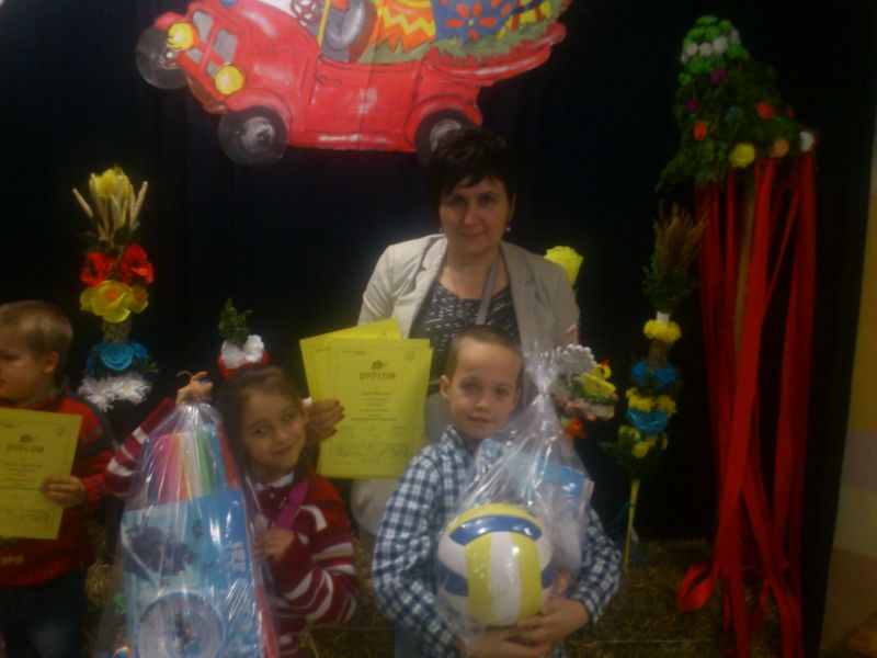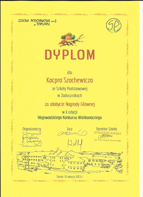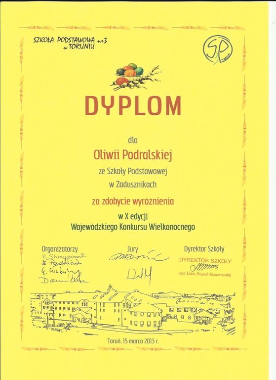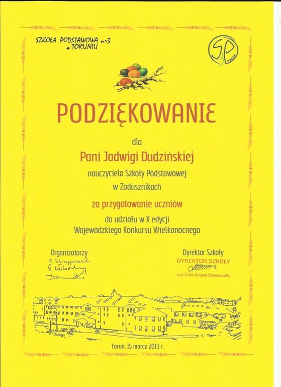 W dniu 15 marca 2013 roku uczniowie kl. I SP im. M. Kopernika w Zadusznikach - Kacper Szachewicz i Oliwia Podralska wraz z opiekunem p. Jadwigą Teresą Dudzińską uczestniczyli w podsumowaniu Wojewódzkiego Konkursu Plastycznego "Najpiękniejsza palma i stroik wielkanocny" połączonym z kiermaszem nadesłanych prac plastycznych. Finał odbył się w SP nr 3 im. kpt Władysława Broniewskiego w Toruniu. Na podsumowanie zostali zaproszeni wszyscy nagrodzeni nagrodą główną i wyróżnieniem uczniowie wraz z opiekunami. Kacper Szachewicz otrzymał Nagrodę Główną w kategorii "Najpiękniejsza palma wielkanocna" natomiast Oliwia Podralska otrzymała Wyróżnienie w kategorii "Najpiękniejszy stroik wielkanocny". Uczniowie zostali obdarowani dyplomami oraz nagrodami. Podziękowanie również otrzymał opiekun uczniów. Zwycięzcom gratulujemy! Poniżej przedstawiamy fotorelacje z uroczystości.