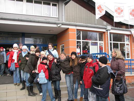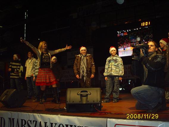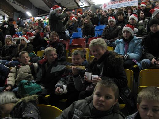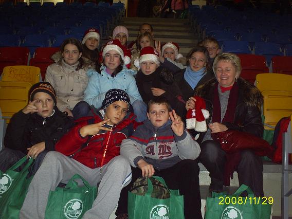 W dniu 29 listopada członkowie Szkolnego Koła Caritas naszej szkoły uczestniczyli w inauguracji Wigilijnego Dzieła Pomocy Dzieciom, które odbyło się na lodowisku Tor - Tor w Toruniu. W tygodniu przed wyjazdem przeprowadzilismy akcję zbiórki pieniedzy na rzecz rehabilitacji dzieci - ofiar przemocy, wypadków i choroby, pod hasłem "Warto być bohaterem" - zebraliśmy 108 zł., co w przeliczeniu na jednego ucznia wyniosło 1,10 zł. Sobotnie spotkanie na lodowisku przyniosło wszystkim uczestnikom wiele radości. Już przy wejściu każde dziecko otrzymało czapkę Mikołaja i słodkie upominki. Po powitaniu przez ks. dyrektora Caritas Diecezji Toruńskiej ks.prał.Daniela Adamowicza obyły się pokazy tańców na lodzie dzieci z ognisk artystycznych i klubów sportowych, odbył się krótki mecz hokeja. W towarzystwie radiowozów policji i straży saniami przybył św. Mikołaj, ktoremu towarzyszyli goście honorowi: ks. biskup djecezji toruńskiej oraz prezydent miasta Torunia, którzy uroczyście zapalili ogromną świecę Wigilijne Dzieło Pomocy Dzieciom. Wielka radością był koncert Majki Jeżowskiej, która zaprosiła na scenę dwoje naszych uczniów - Monikę Przybyszewską i Krystiana Lewkowicza. Za taniec z piosenkarką otrzymali oni płytę z dedykacją i autografem artystki.