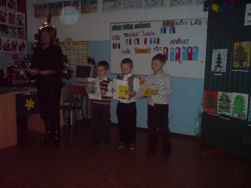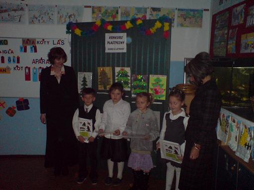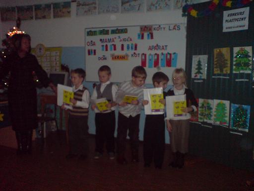 Święta Bożego Narodzenia, to Święta, na które najbardziej wszyscy czekamy. Jest to najpiękniejszy i najbardziej rodzinny okres roku. Wdrażając dzieci do kultywowania tradycji związanych ze Świętami, nauczyciel oddziału przedszkolnego przy Szkole Podstawowej im. Mikołaja Kopernika w Zadusznikach p. mgr Marianna Człapińska zorganizaowała gminny konkurs plastyczny dla dzieci 6-letnich "Moja Wymarzona Choinka Bożonarodzeniowa". W konkursie wzięły udział wszystkie dzieci 6-letnie z naszej szkoły, Publicznego Przedszkola w Wielgiem, oddziału przedszkolnego przy SP w Wielgiem i SP w Czarnem. Rozstrzygnięcie konkursu nastąpiło 17.12.2008 r. Komisja w składzie: przewodnicząca - p. mgr Marianna Człapińska, członek - p. mgr Marzena Romanowska, członek - p. mgr Mirosława Zielińska dokonała wnikliwej oceny zgłoszonych prac. I miejsce komisja przyznała Oliwii Kapuścińskiej ( Publiczne Przedszkole w Wielgiem ) i Mateuszowi Kwaśniewskiemu ( SP Zaduszniki ), II miejsce Anecie Szynalskiej ( SP Czarne ) i Wiktorii Sadziak ( SP Zaduszniki ), III miejsce Ewie Brzozowskiej ( SP Wielgie ). Ponadto zostały przyznane następujące wyrożnienia: Szymon Brzozowski ( Publiczne Przedszkole w Wielgiem ), Damian Gontarski ( SP Zaduszniki ), Piotr Capała ( Publiczne Przedszkole w Wielgiem ), Adam Trzciński ( Publiczne Przedszkole w Wielgiem ), Izabela Kurowska ( Publiczne Przedszkole w Wielgiem ), Wiktor Bochiński ( SP Zaduszniki ). Sponsorem nagród rzeczowych w tym konkursie byli Państwo Beata i Paweł Ręgoccy z Zadusznik, poczęstunek ufundowała Rada Rodziców przy Szkole Podstawowej w Zadusznikach. Organizator składa serdeczne podziękowanie Państu Beacie i Pawłowi Ręgockim, Radzie Rodziców oraz opiekunom: p. Agnieszce Lewandowskiej, p. Beacie Szarwińskiej, p. Elżbiecie Leśniewskiej, p. Mariannie Człapińskiej i p. Magdzie Orych za przygotowanie dzieci do konkursu. Życzymy zdrowych i szczęśliwych Świąt Bożego Narodzenia.